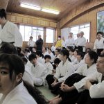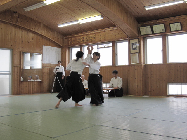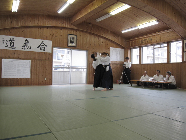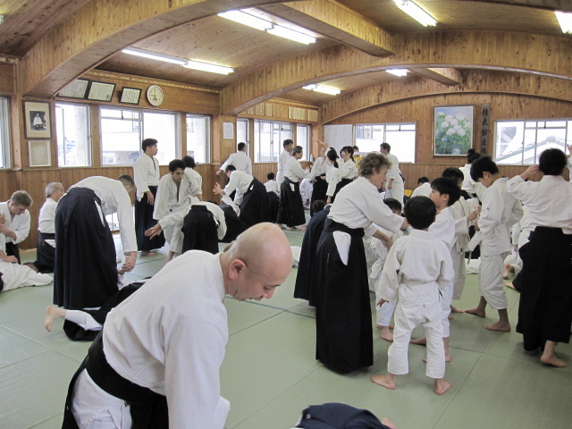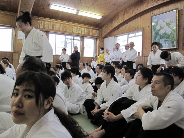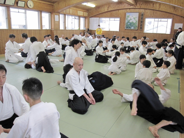 どういう訳か? 一番活気のある日が審査日です。8時過ぎから多くの人が道 場に集まってきます。稽古が始まると一人1畳はない空間でやり取りが始まりま す。人いきれであっという間に汗が滴り落ち笑顔満開、窓も真っ白。 5級審査から始まり、級審査の後は少年部です。今回も20人ほどの子供達が膝 行・回転膝行&前受け身・・と審査課題をこなしていきます。審査中、思わずニ ヤリとさせられる事や、見学している子からの歓声が飛び交い和気藹々。 初段、4人の女性が挑みます。参段は、弐段を受けてから20数年ぶりのベテラ ン、も緊張しながらもふわふわやってます‥。二人の実力者が四段受け。ま ぁ・・このクラスになるとミモノです‥! 審査後、結果発表まで、恒例の演武会。持ち時間は1分。〆は道場長82歳&F七 段74歳、足して150歳以上コンビ、での審査の反省を込めての「模範演武」。 この春大学を卒業する人達の祝いを兼ねての食事。そば焼き・うどん焼き・寿 司・野菜ヒネ鳥豚足煮込み・サバ&アジのきずし・・の料理に、福島と灘の酒で 幸福口福。セルビアの香しき酒も・・。
